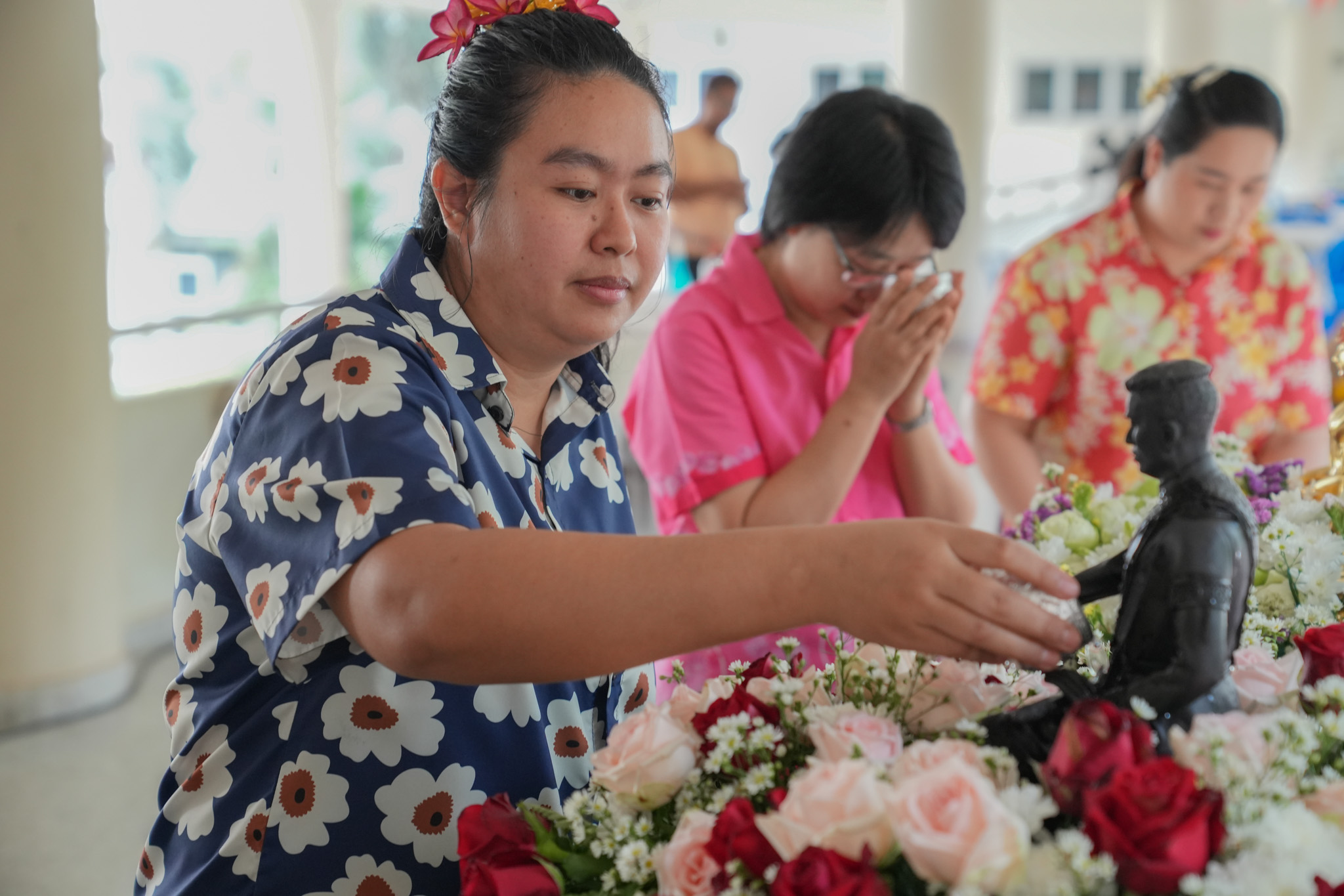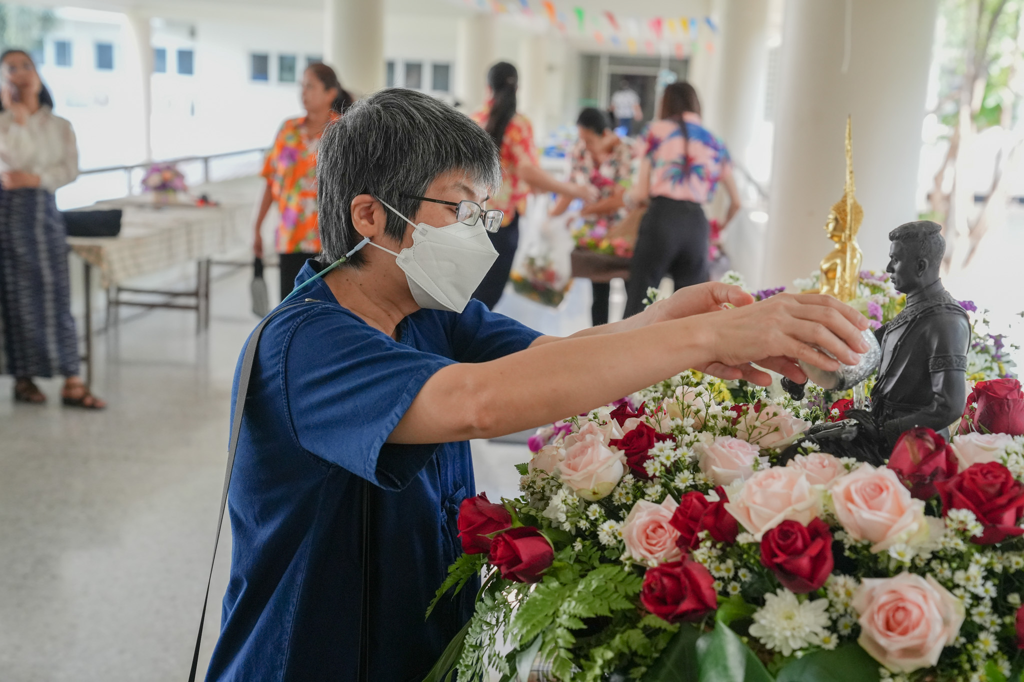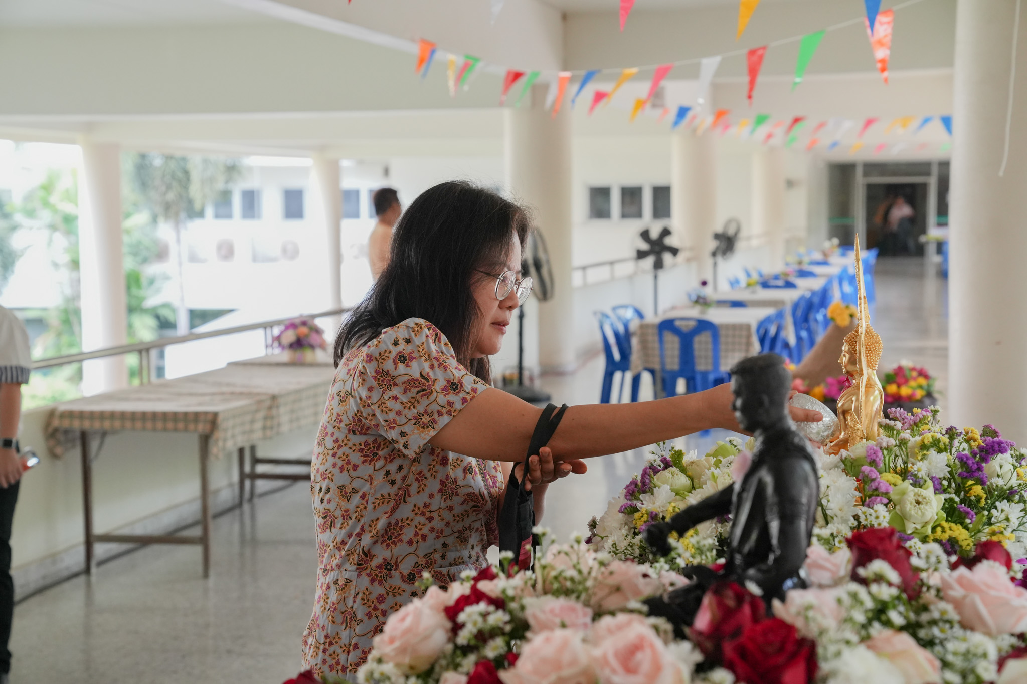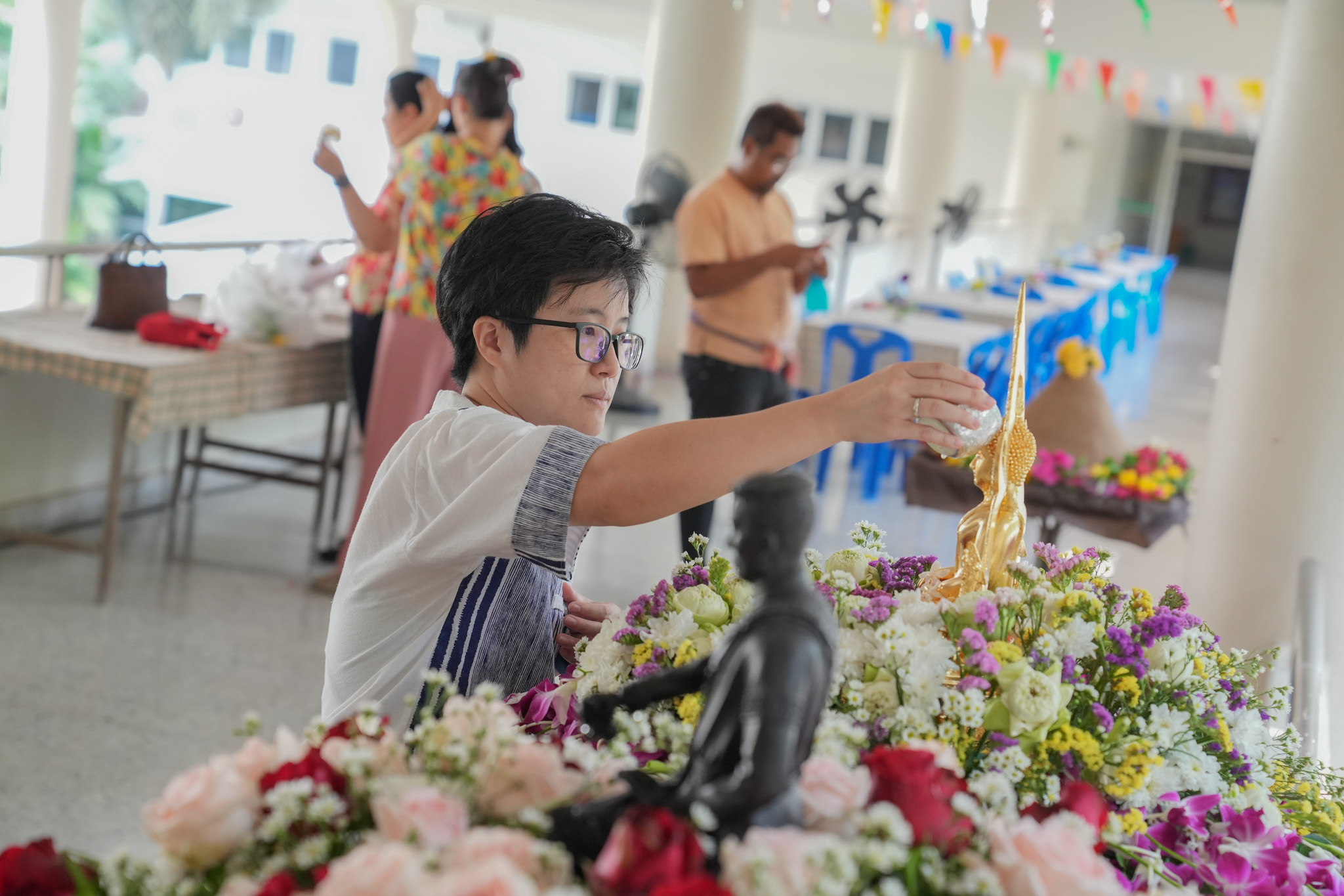 พิธีสรงน้ำพระพุทธรูป รูปหล่อสมเด็จพระนเรศวรมหาราช และรดน้ำพานดอกไม้เพื่อรำลึกถึงอาจารย์ผู้ล่วงลับ