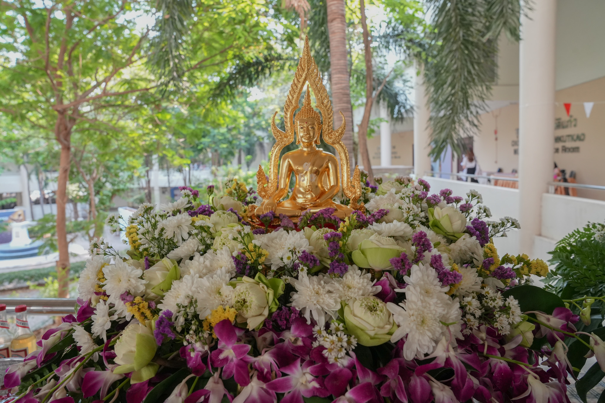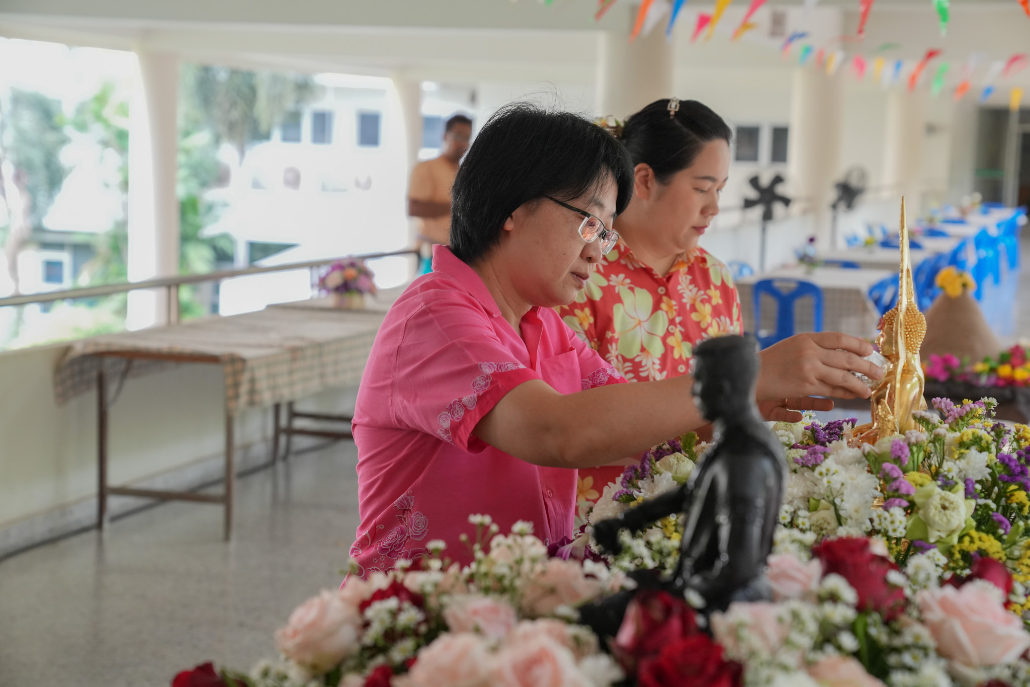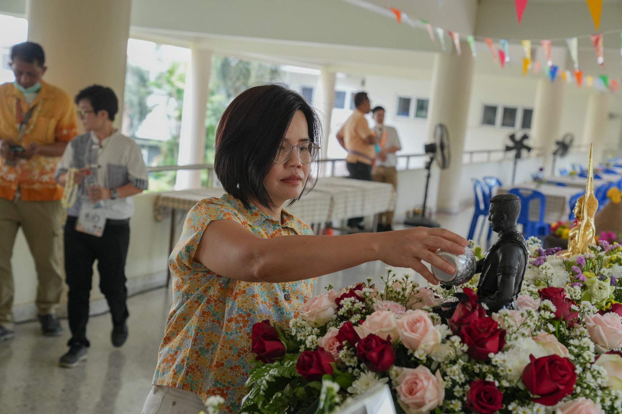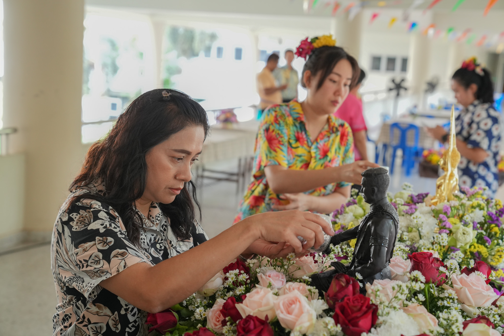 พิธีสรงน้ำพระพุทธรูป รูปหล่อสมเด็จพระนเรศวรมหาราช และรดน้ำพานดอกไม้เพื่อรำลึกถึงอาจารย์ผู้ล่วงลับ