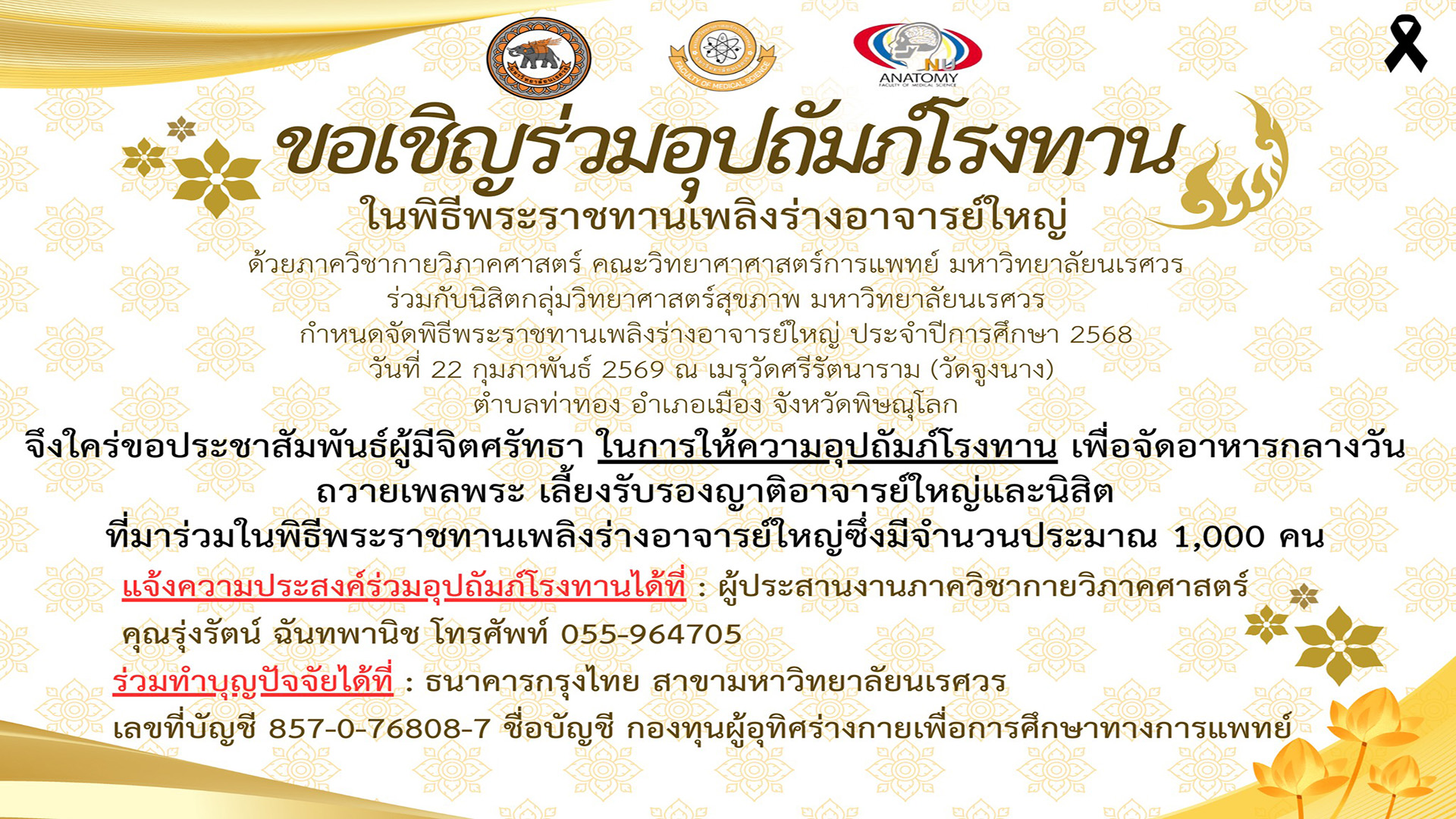 ขอเชิญชวนผู้มีจิตศรัทธาร่วมอุปภัมภ์โรงทาน ในพิธีพระราชทานเพลิงร่างอาจารย์ใหญ่ ประจำปีการศึกษา 2568ซึ่งมีกำหนดจัดพิธีในวันอาทิตย์ที่ 22 กุมภาพันธ์ 2569ณ เมรุวัดศรีรัตนาราม (วัดจูงนาง) ตำบลท่าทอง…